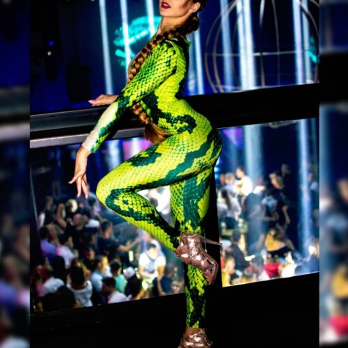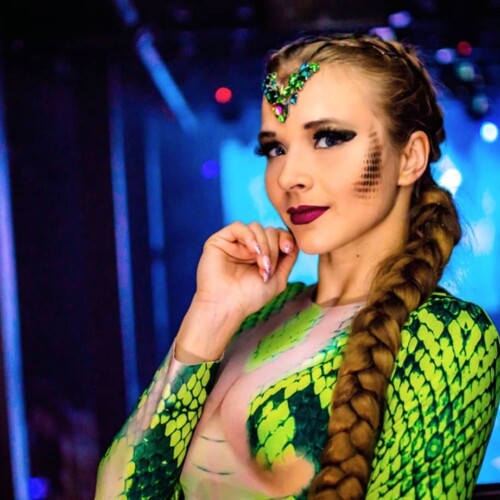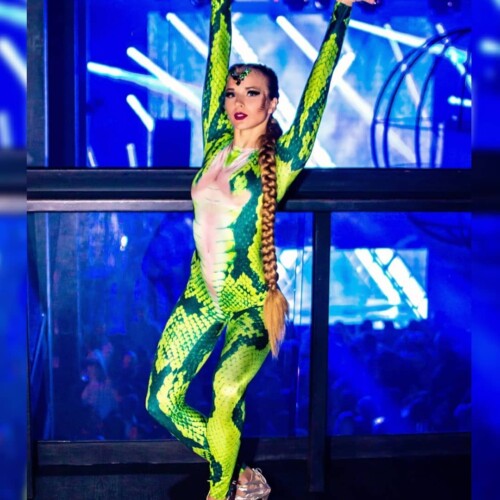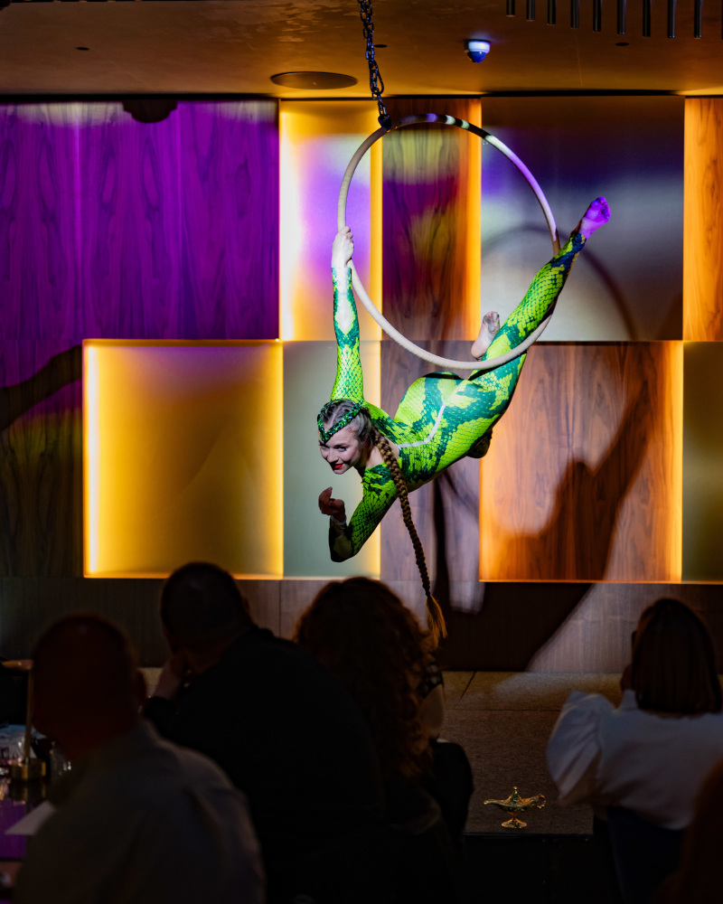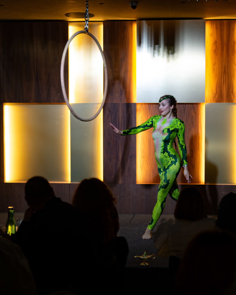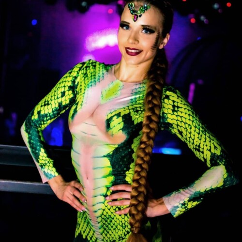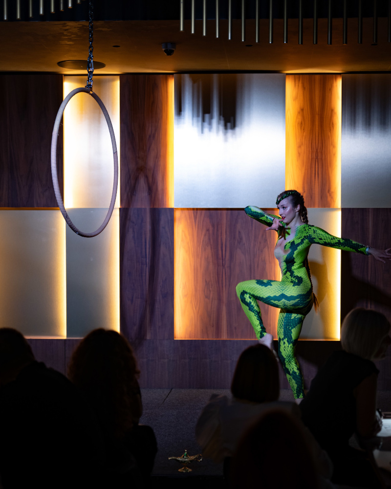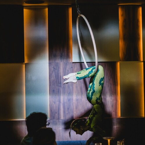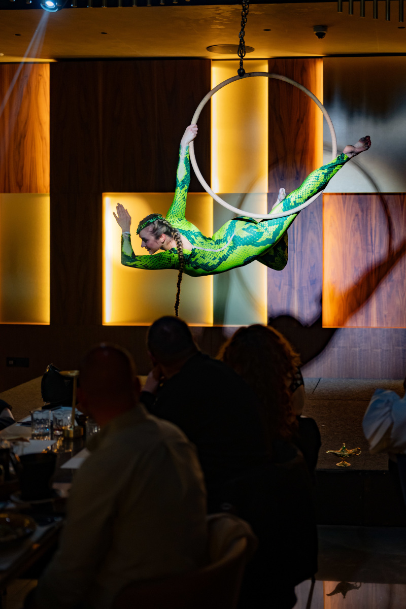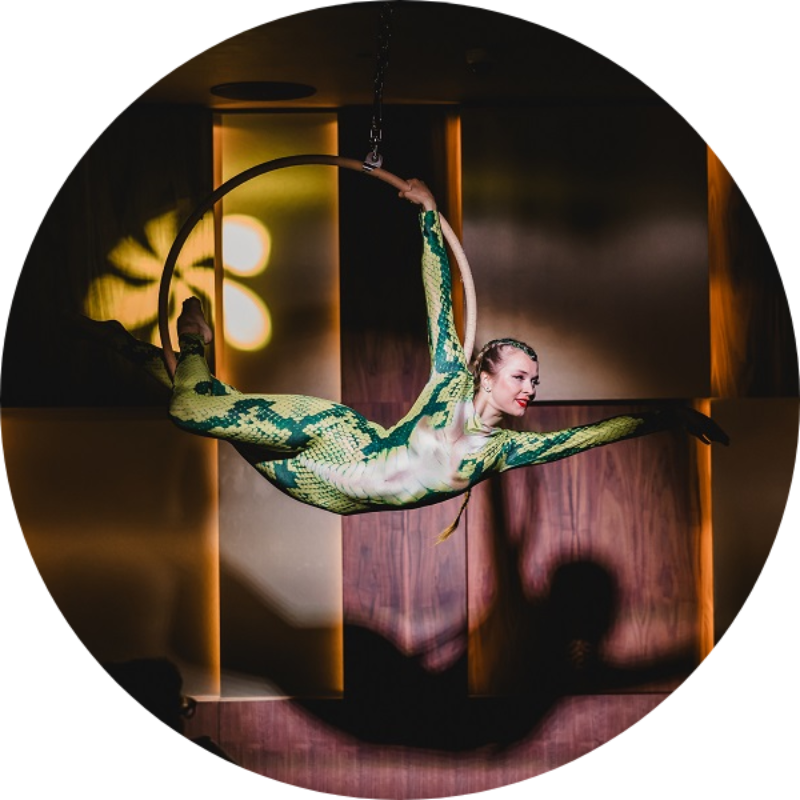 For the full effect another performer can play the flute while the scene unfolds. After the opening moment the costume transforms into a snake-skin outfit, and the performance continues with an aerial hoop sequence where the character climbs and performs aerial tricks.