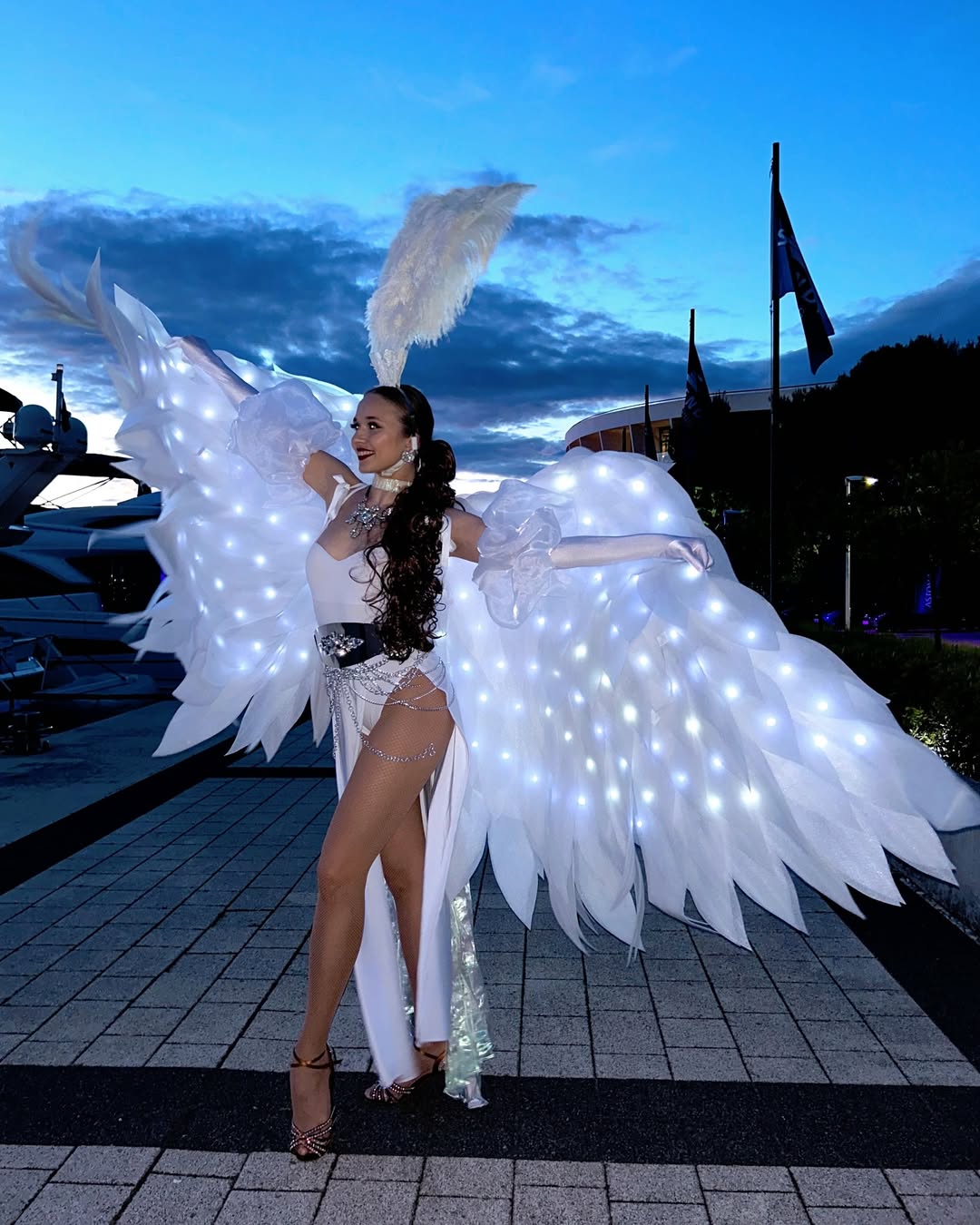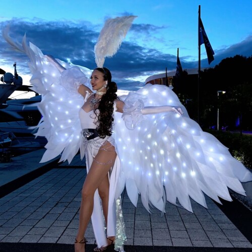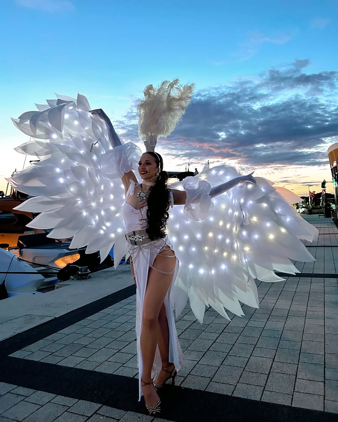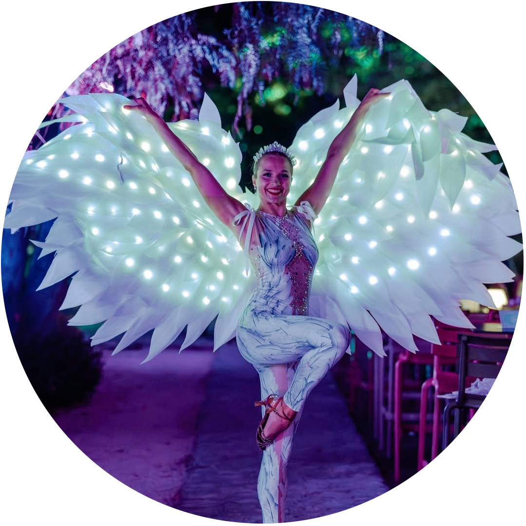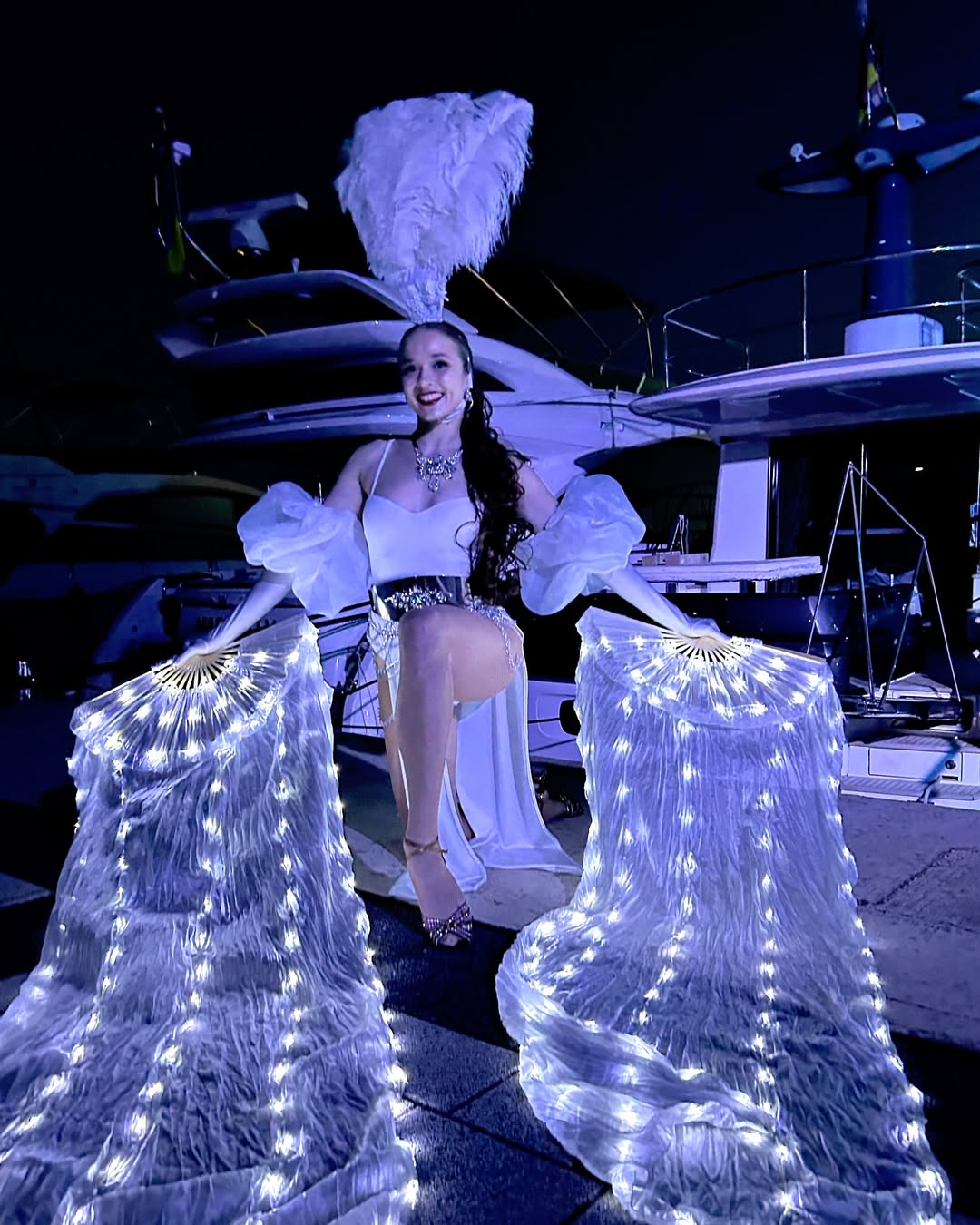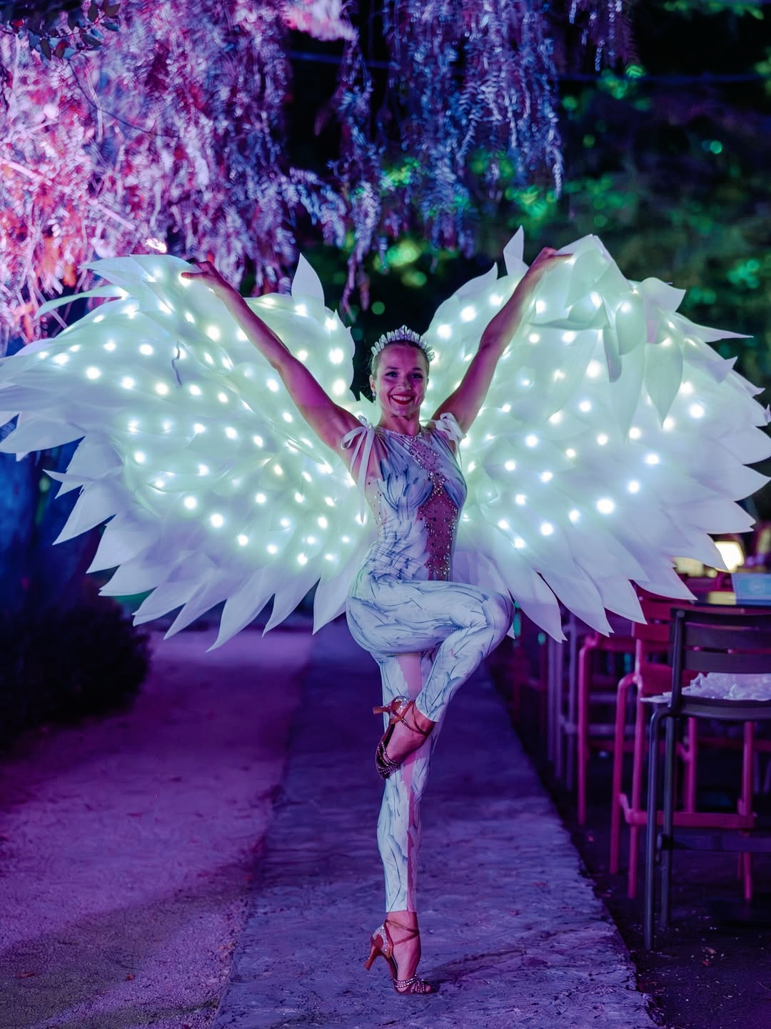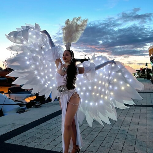 As the performance develops, LED Isis wings appear and glowing fan veils add flowing light patterns to the choreography. The combination of props creates a layered visual journey from soft elegance to bright luminous movement.
