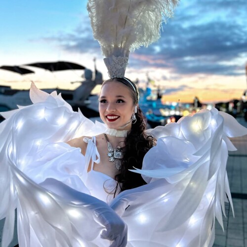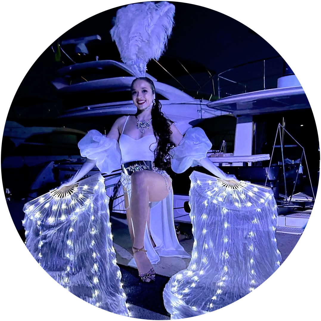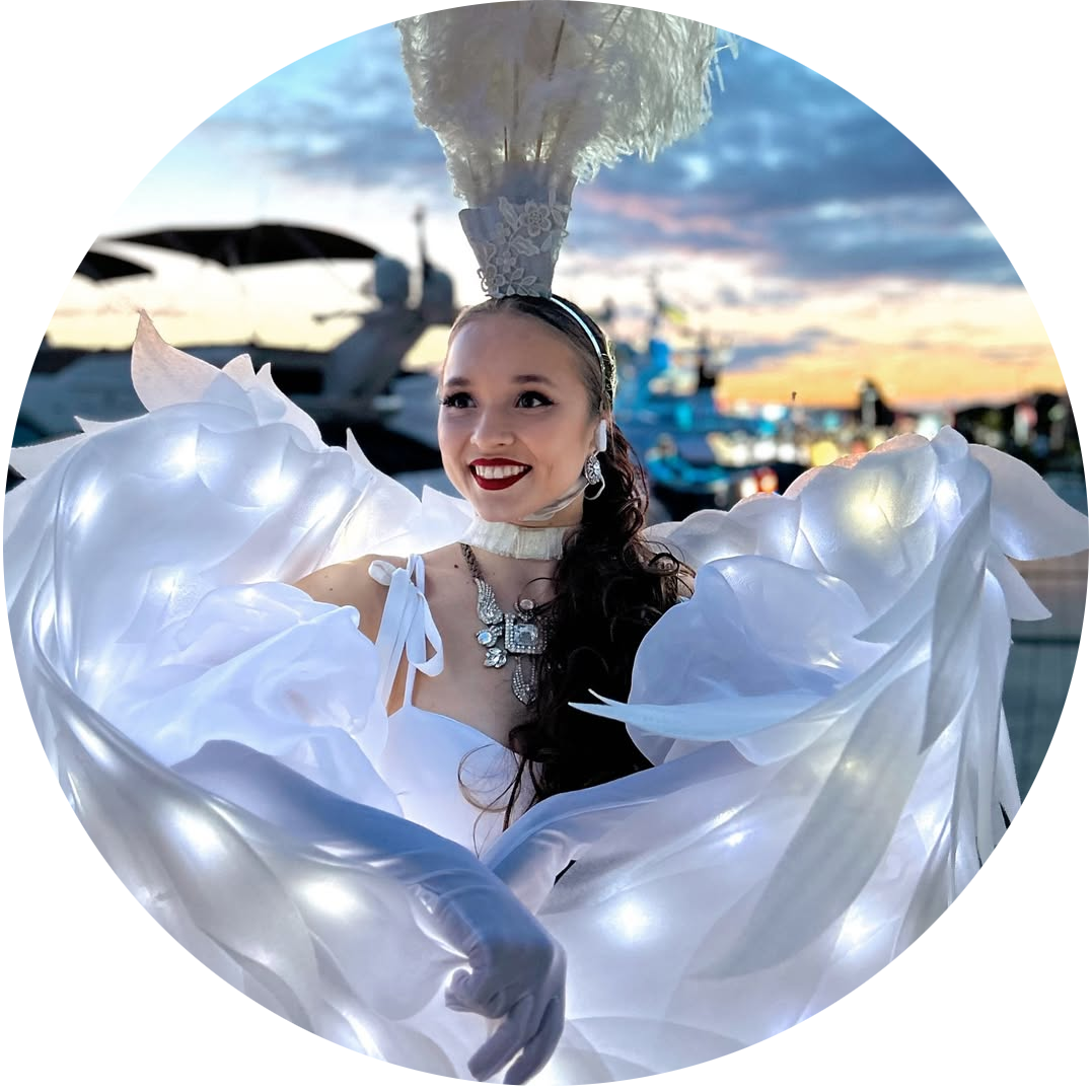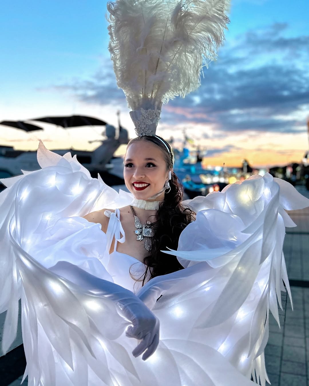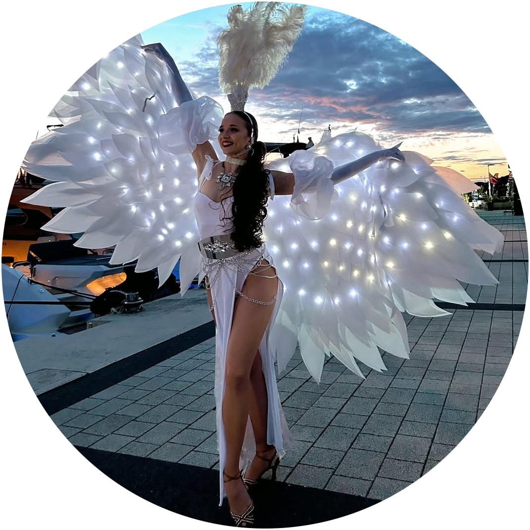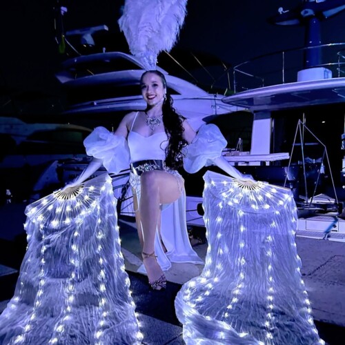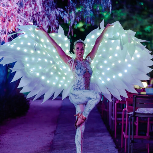 As the performance develops, LED Isis wings appear and glowing fan veils add flowing light patterns to the choreography. The combination of props creates a layered visual journey from soft elegance to bright luminous movement.