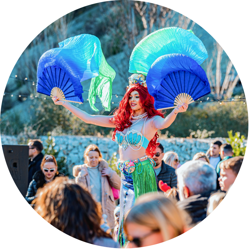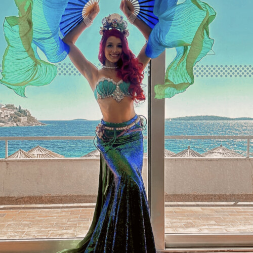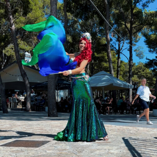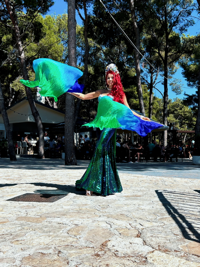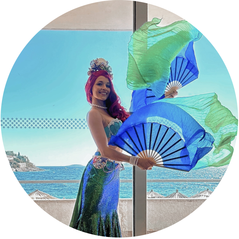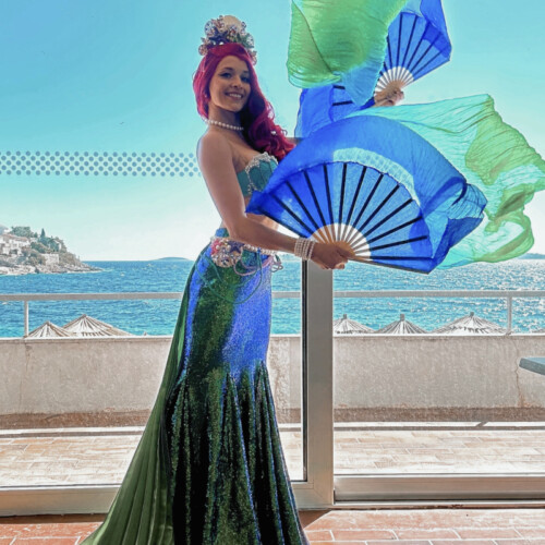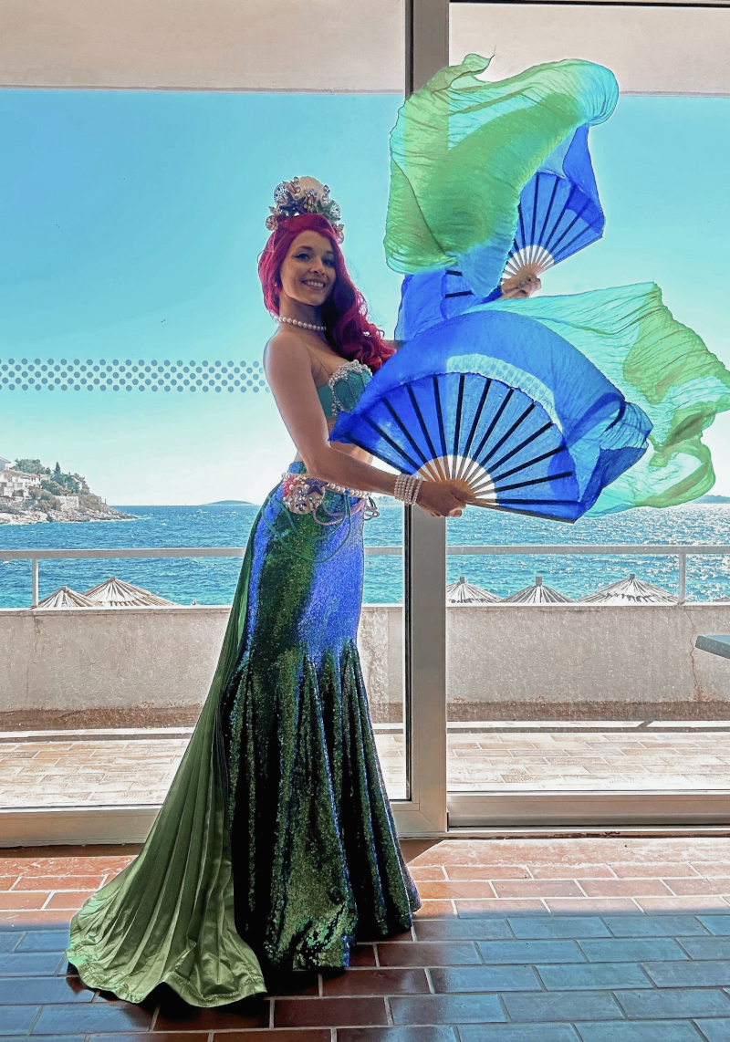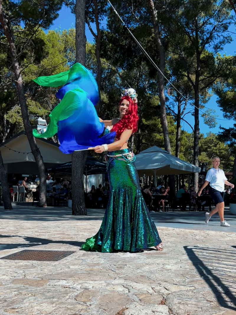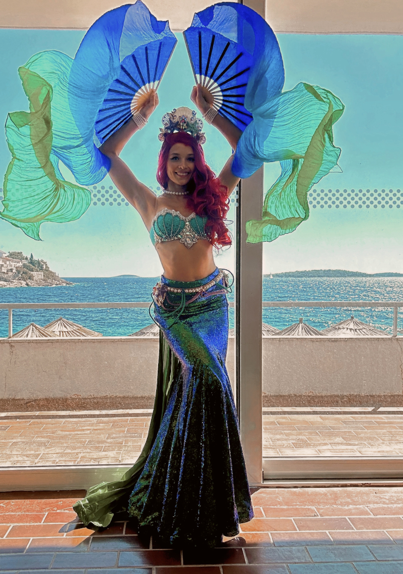 The costume recreates the recognizable character while colorful fan veils bring lively movement to the choreography.