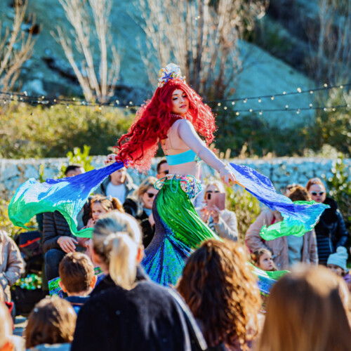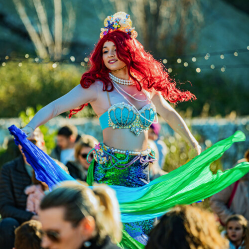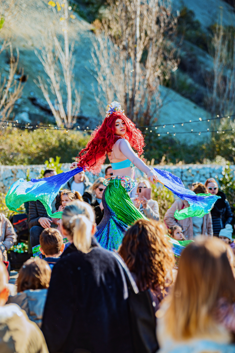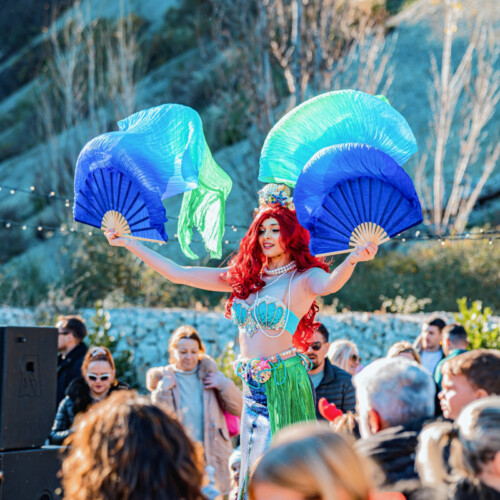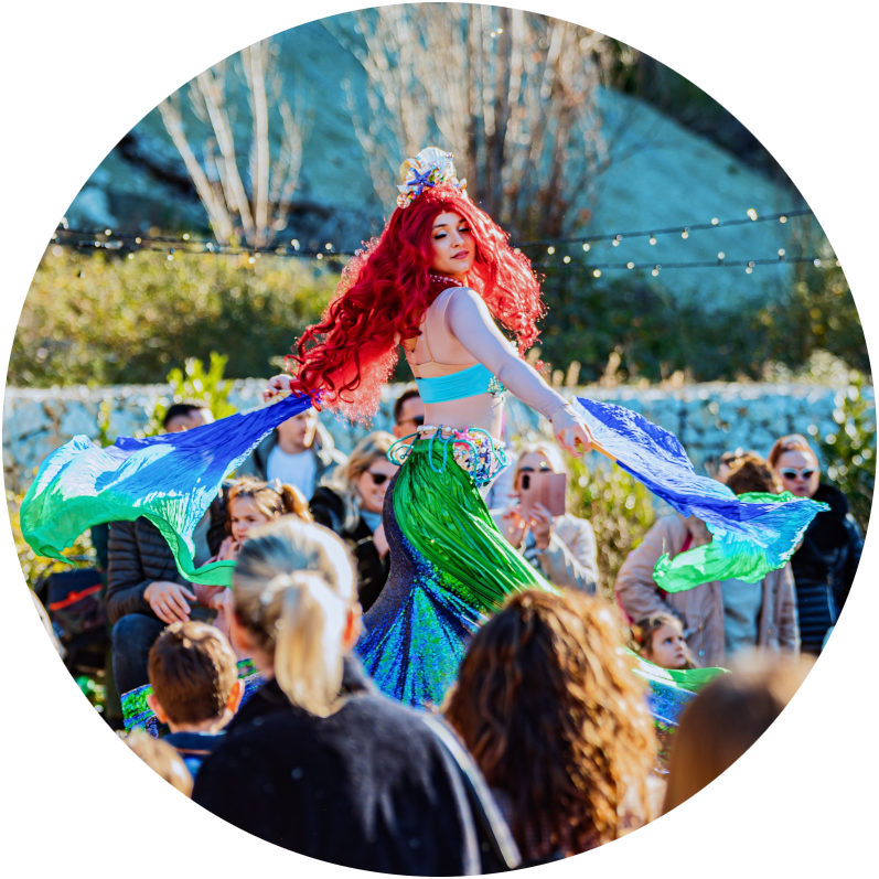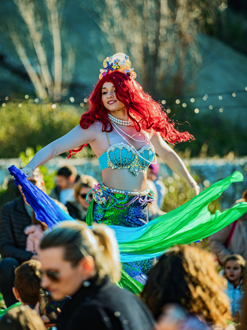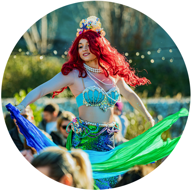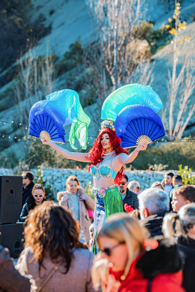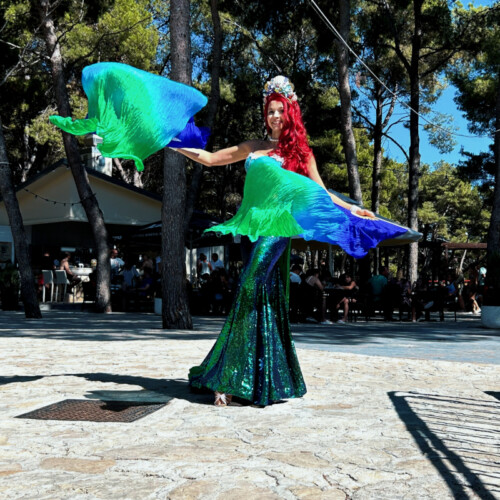 The costume recreates the recognizable character while colorful fan veils bring lively movement to the choreography.
