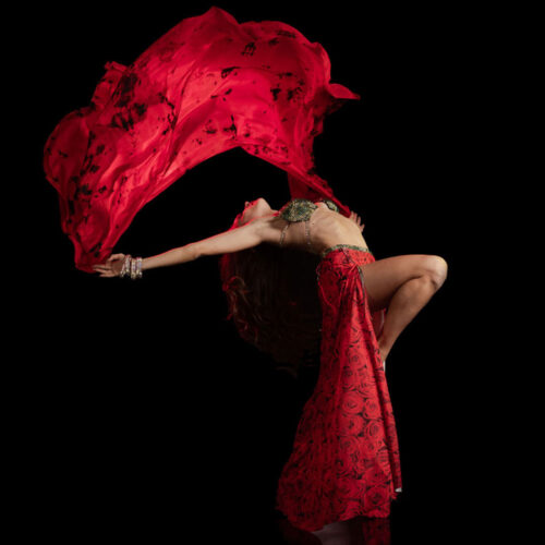A long silk veil follows the dancer through spins, turns, and flowing steps.
