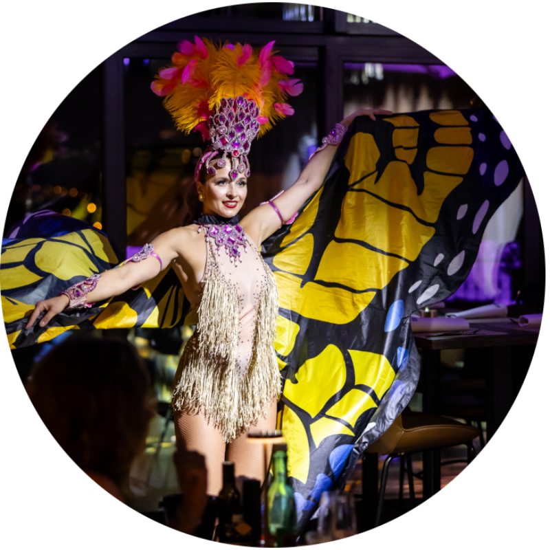 The choreography stays energetic and playful, making it suitable for both children’s programs and lively Latin-themed events. Because the wings expand during movement, some space is required for the choreography.