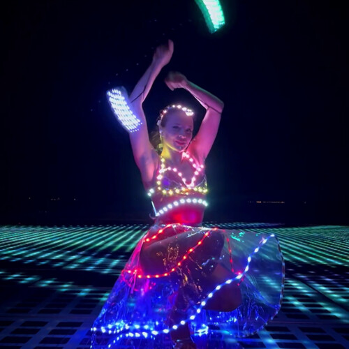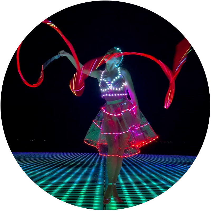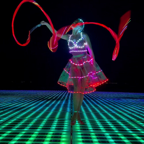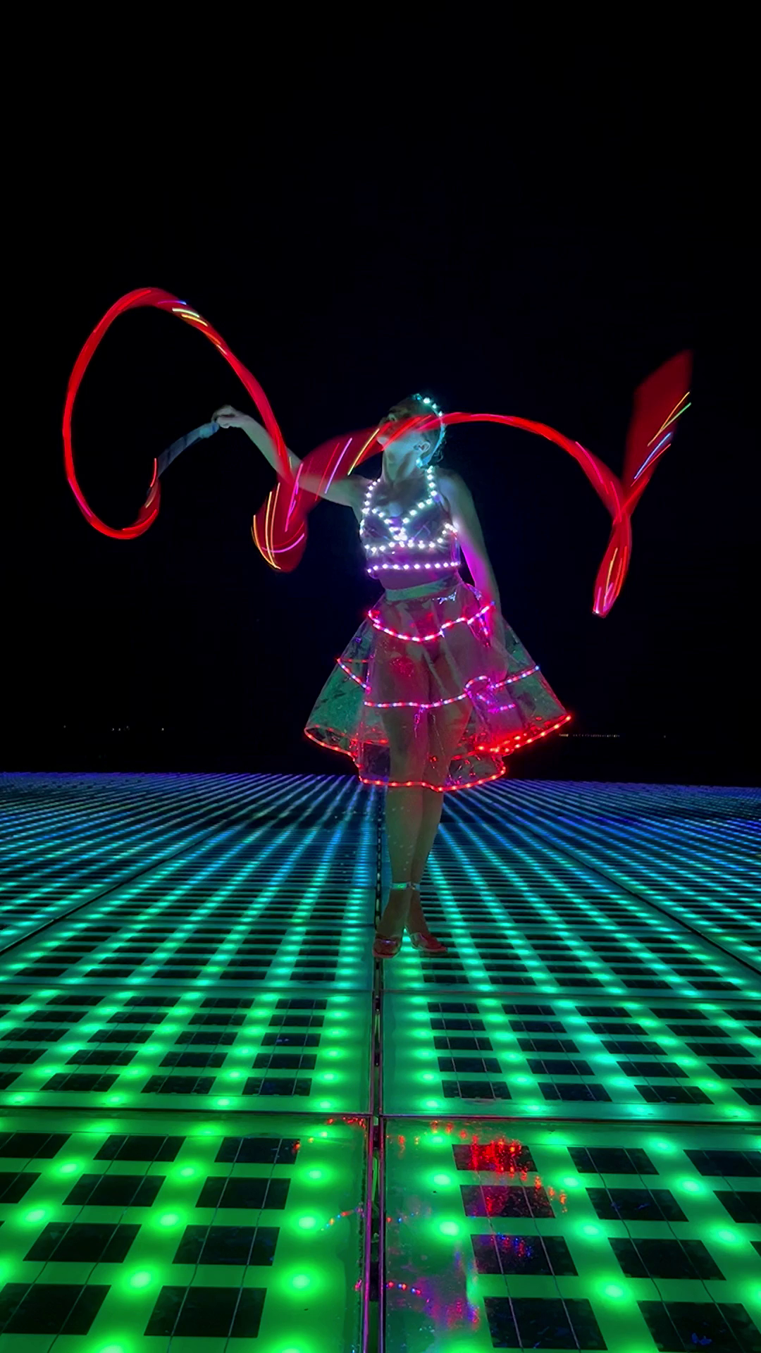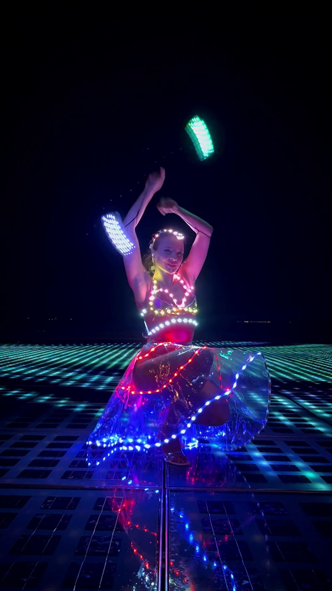 Several illuminated props appear throughout the act, including LED wings, LED ribbon, and LED poi. Each prop creates a different style of light movement — wide glowing shapes from the wings, flowing ribbons of color through the air, and fast spinning circles created by the poi.