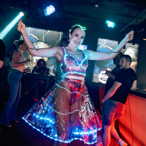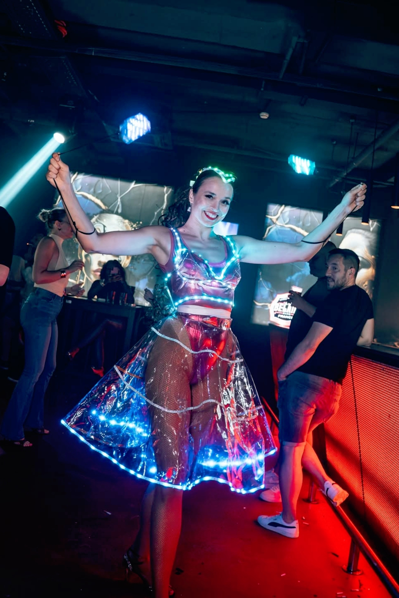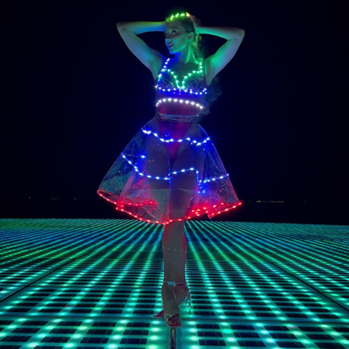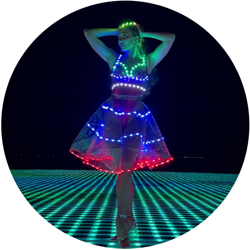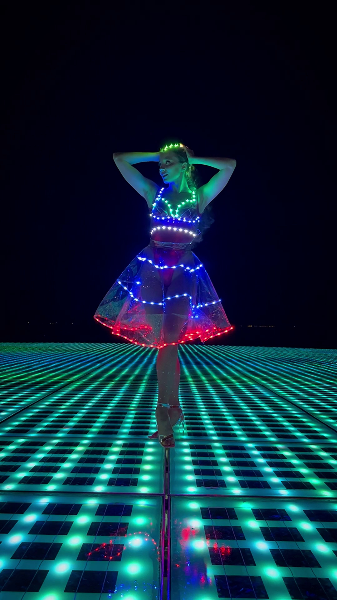 Several illuminated props appear throughout the act, including LED wings, LED ribbon, and LED poi. Each prop creates a different style of light movement — wide glowing shapes from the wings, flowing ribbons of color through the air, and fast spinning circles created by the poi.