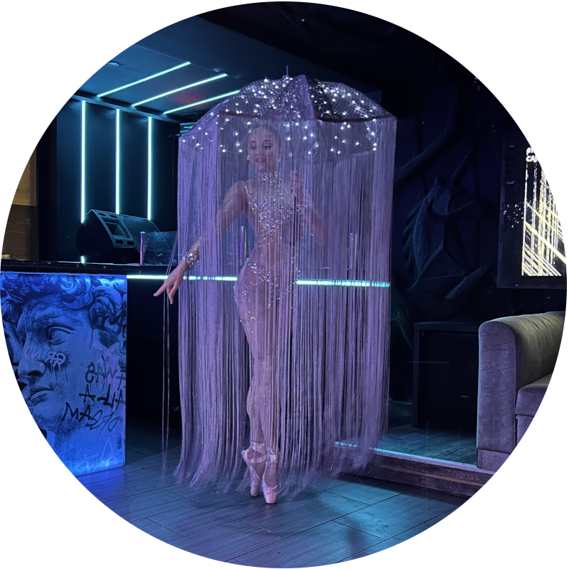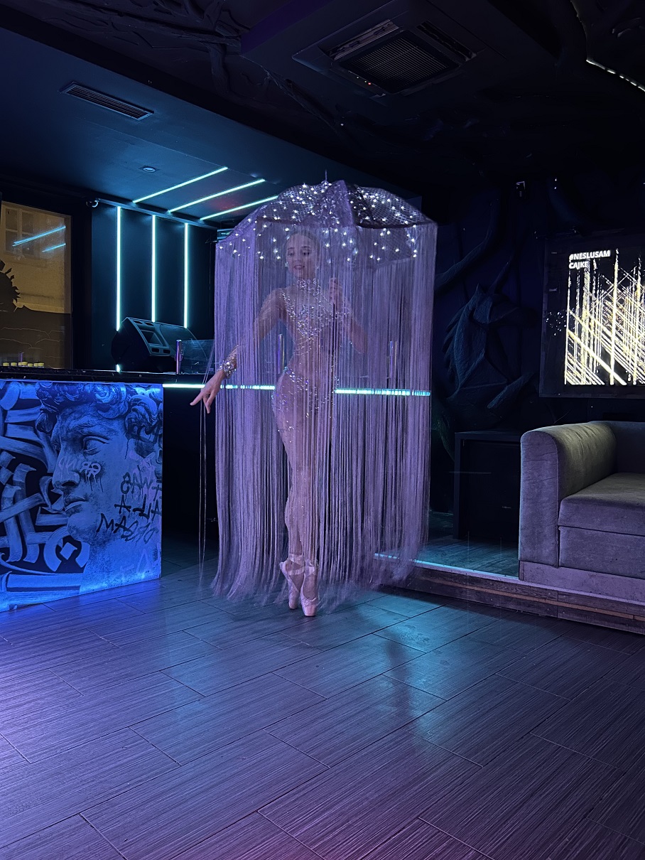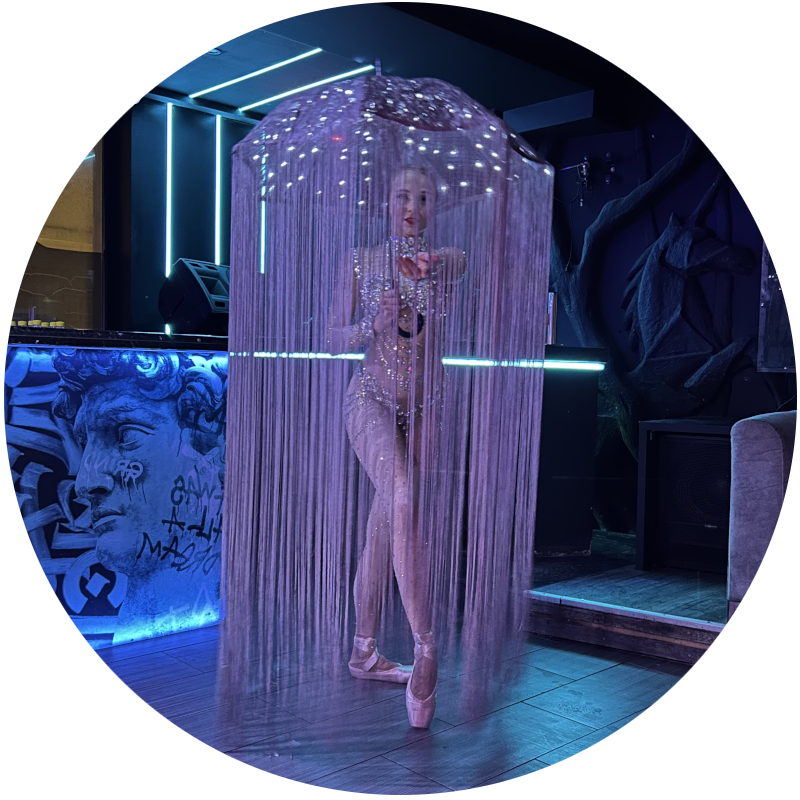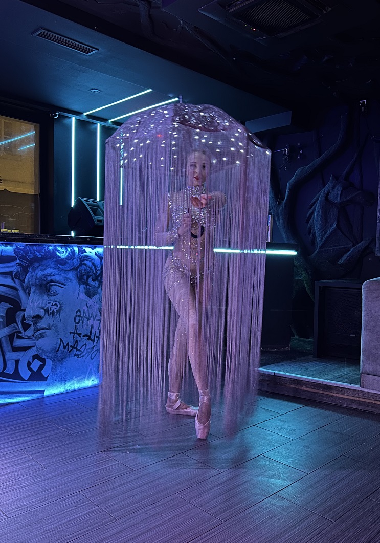 The choreography is performed on pointe shoes, adding elegance and lightness to the visual effect. Because of the length of the umbrella fringe, enough space is required so it can move freely without touching obstacles.