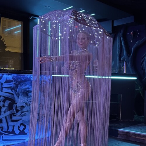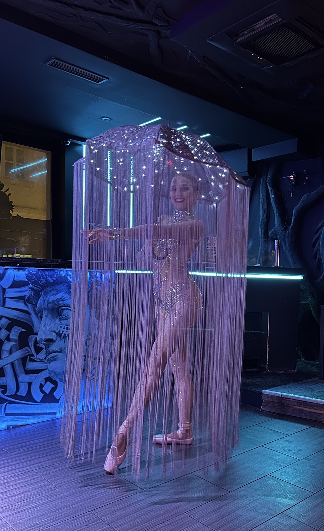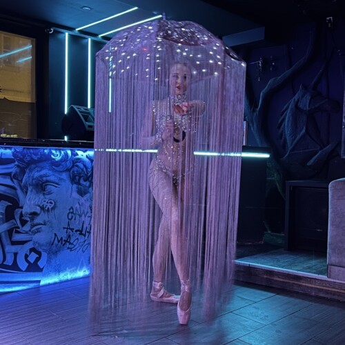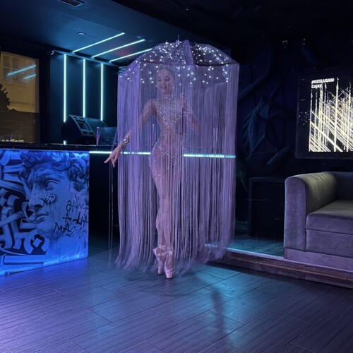 The glowing umbrella is decorated with transparent beads that resemble falling raindrops. Long fringe attached to the umbrella extends down toward the floor and moves dramatically during spins.