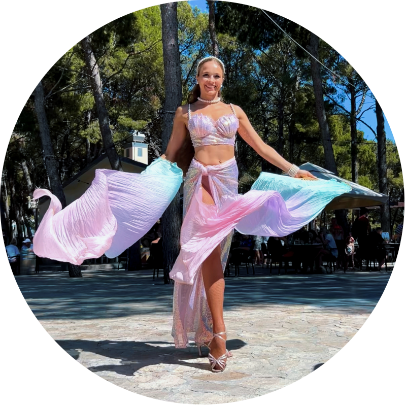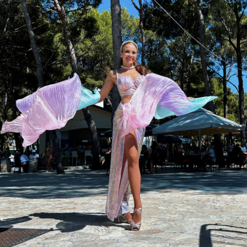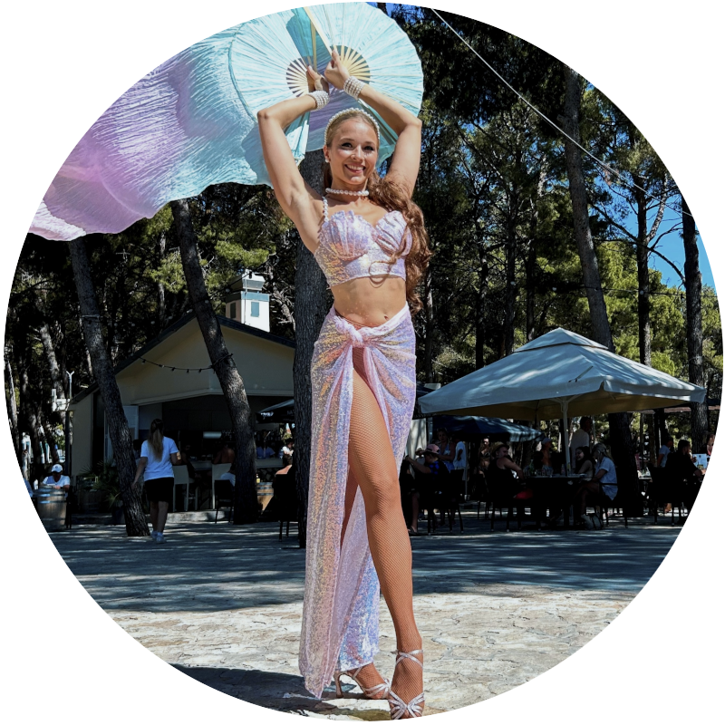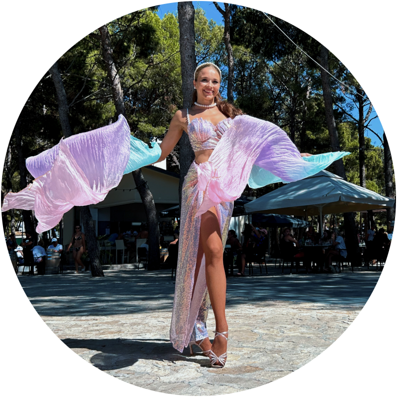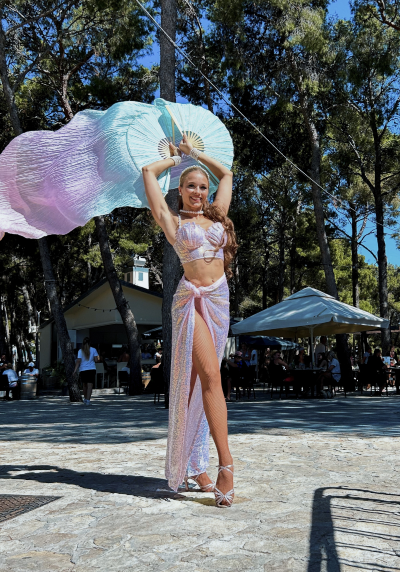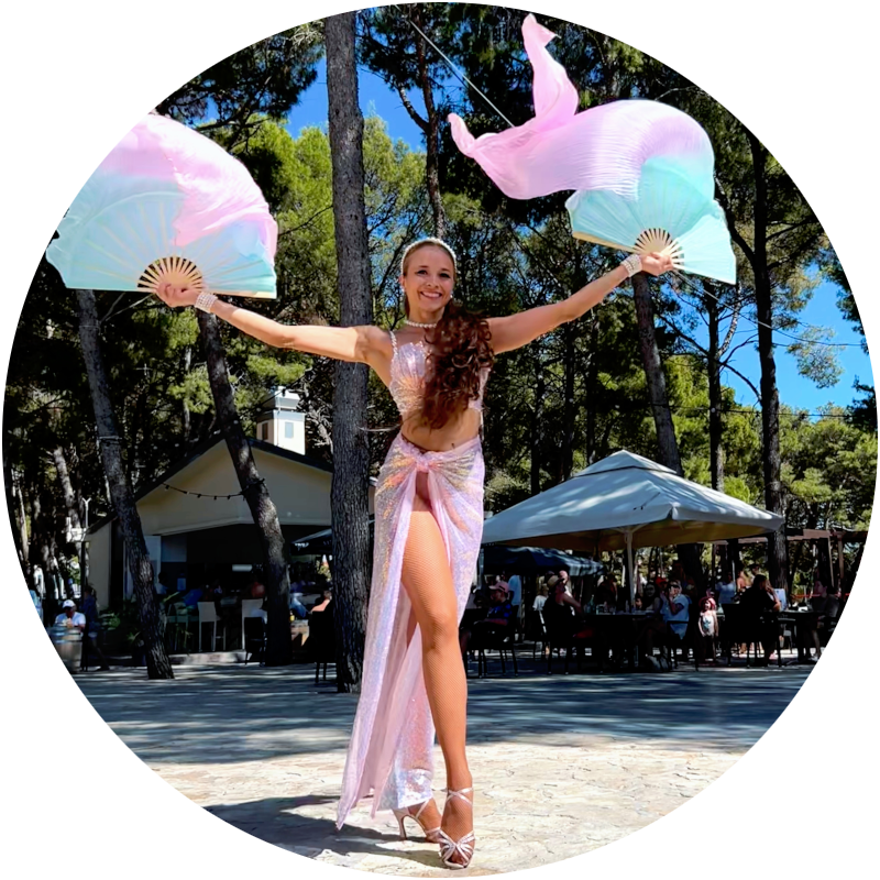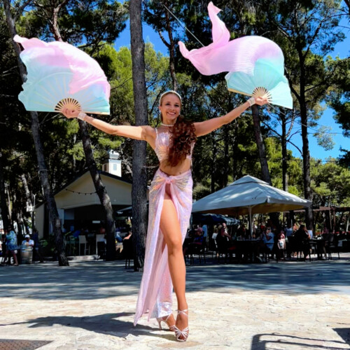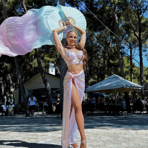 Unlike many LED acts, this performance also works beautifully in daylight settings such as beach clubs, hotel terraces, or poolside events. The pink styling and airy movement create a relaxed summer mood. Fan veils add volume to the choreography, so enough space should be available for the fabric to move freely.