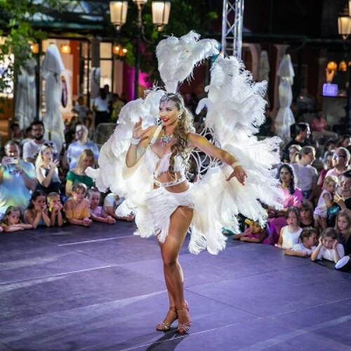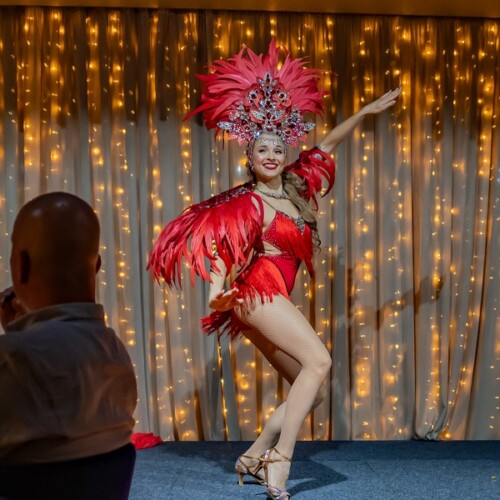 Feathered costume elements create a festive visual look while fast samba footwork keeps the performance energetic from beginning to end. The act uses the iconic song Samba de Janeiro, which instantly lifts the mood and invites audience engagement.