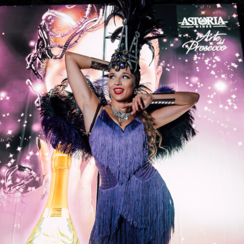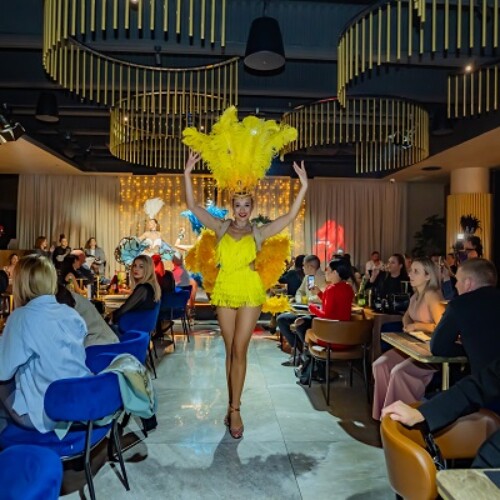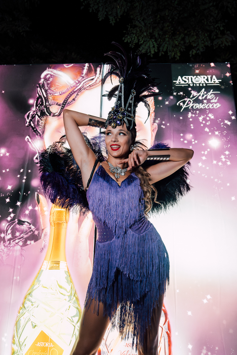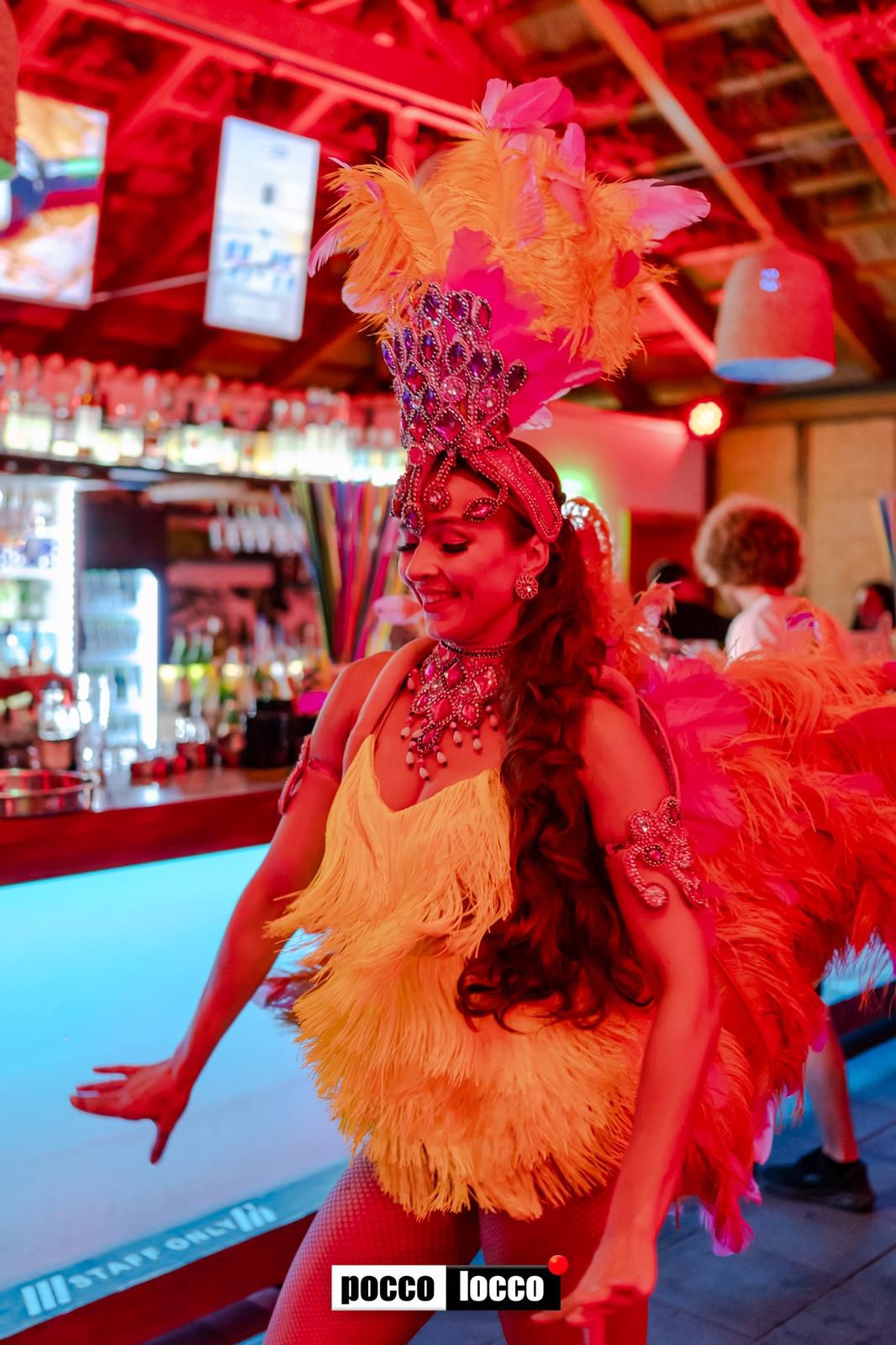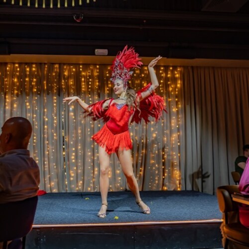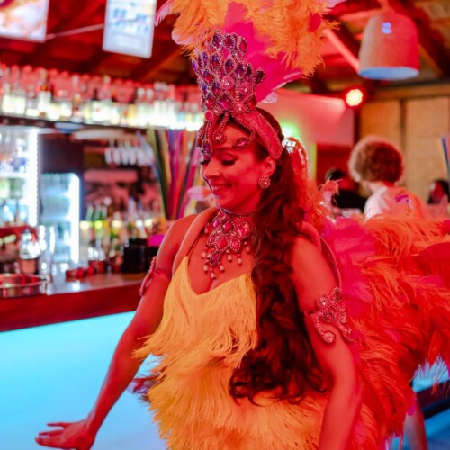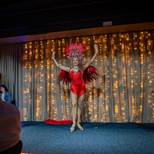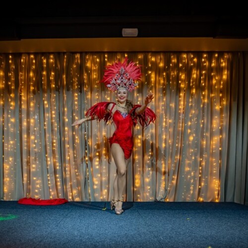 The costume includes decorative feathers, so some space is needed to allow the movement to flow freely. At the same time, the act still adapts well to clubs where the stage area may be smaller.