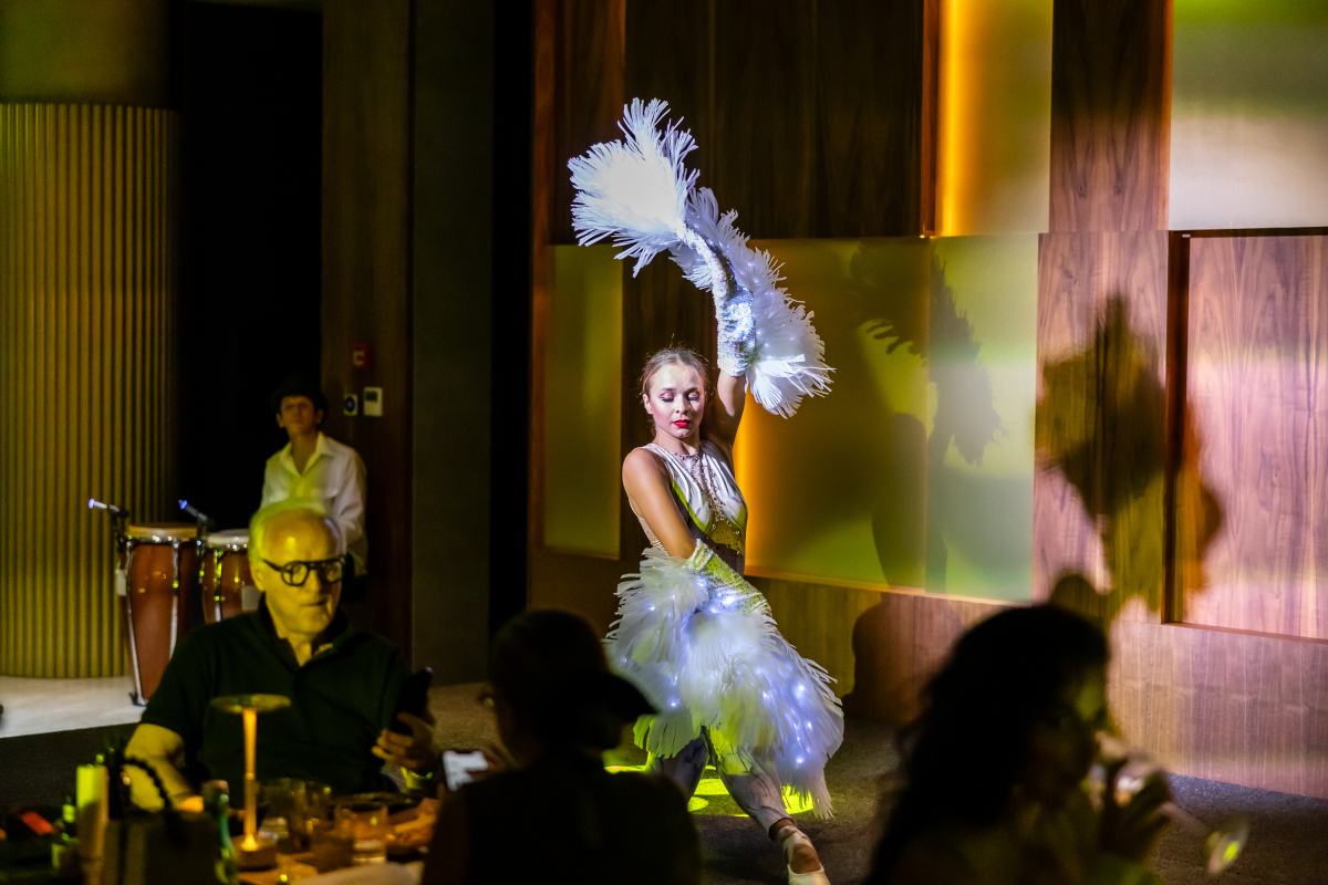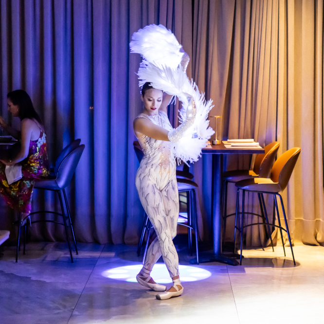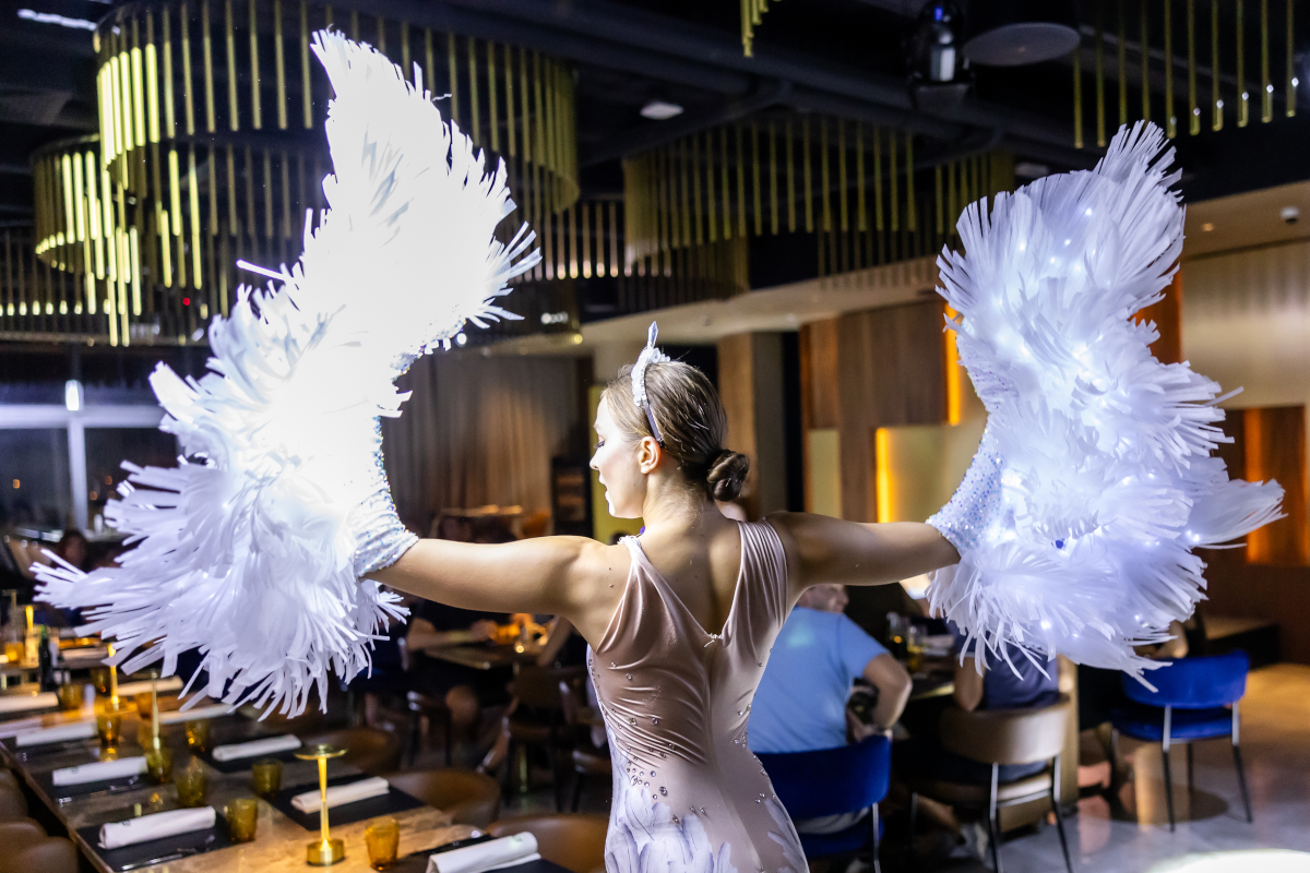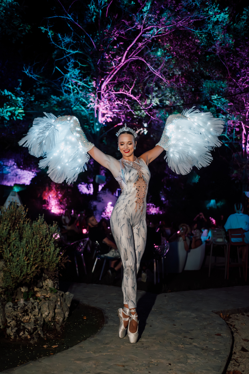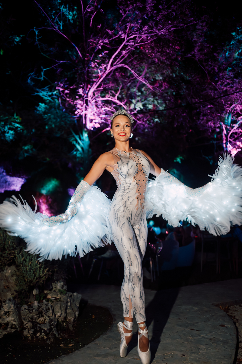 The act blends ballet movement with modern lighting effects, creating a calm and elegant stage atmosphere. Because the choreography includes pointe work, the floor must be smooth and stable.